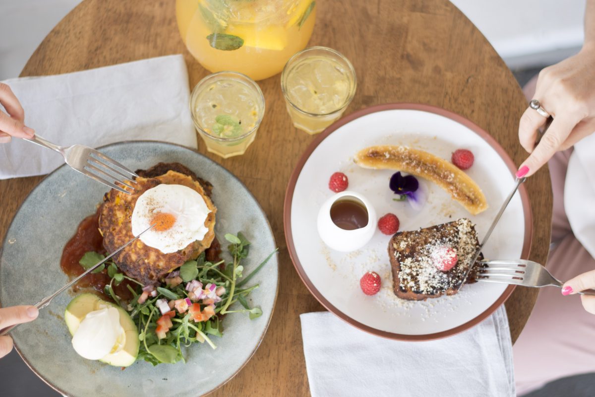 Corn & zucchini fritters – tomato & capsicum chutney, avocado, feta, rocket 25